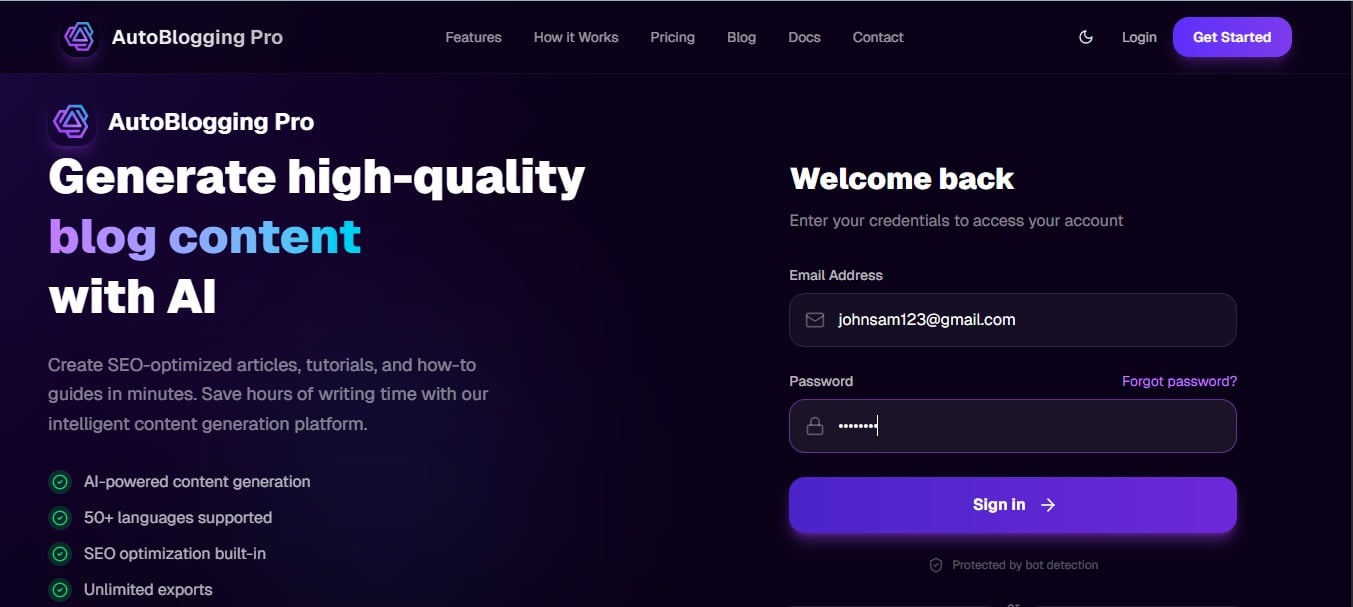 Access your Autoblogging.pro dashboard using your credentials.
